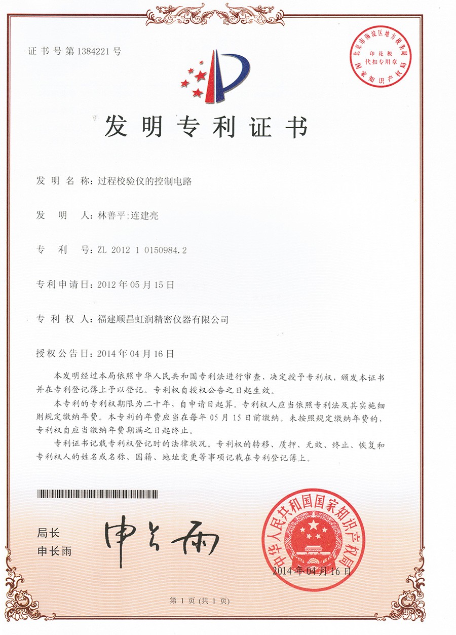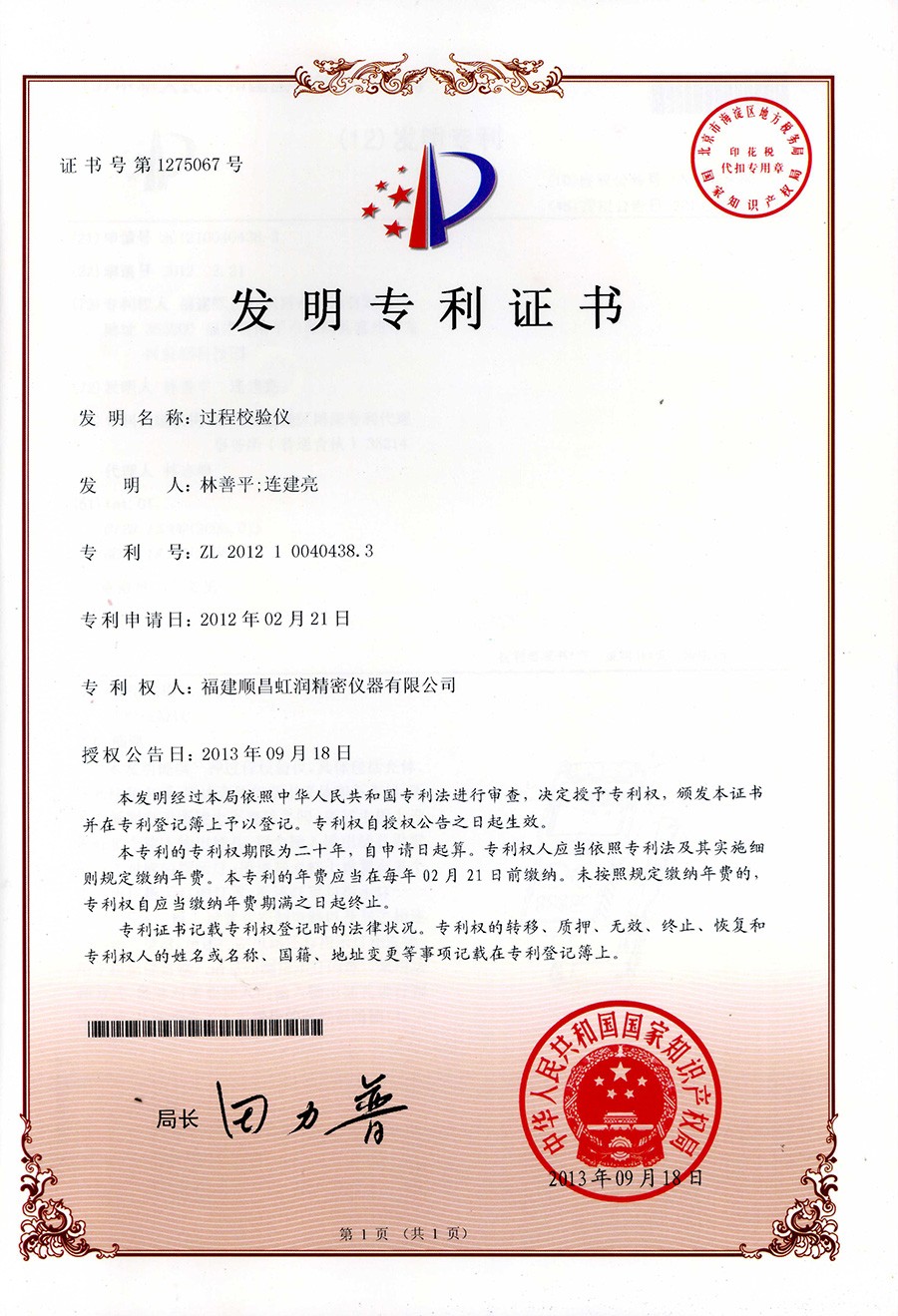 過程校驗儀發(fā)明 發(fā)明專利證 |