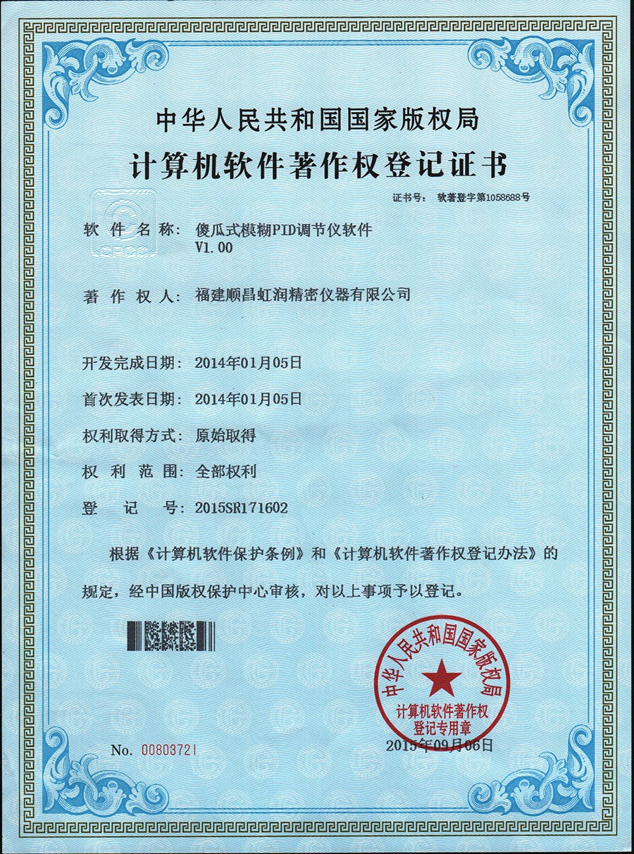 虹潤公司人工智能算式與模糊PID算式是虹潤公司應(yīng)用自主知識產(chǎn)權(quán)開發(fā)的新一代智能溫控儀表,產(chǎn)品榮獲一種人工智能調(diào)節(jié)器及其調(diào)節(jié)方法(專利號:2016107742425)、模糊PID控制儀及控制方法(專利號2015109378814)、一種智能化控制器及自整定方法(專利號2016103155465)、閥門自動、手動無擾動操作控制方法及裝置(專利號2007101540083)4項國家發(fā)明專利,NHR人工智能模糊PID調(diào)節(jié)器(版權(quán)登記號2009SR044371)傻瓜式模糊PID調(diào)節(jié)儀軟件V1.00 (版權(quán)登記號2015SR171602)2項軟件著作權(quán)。