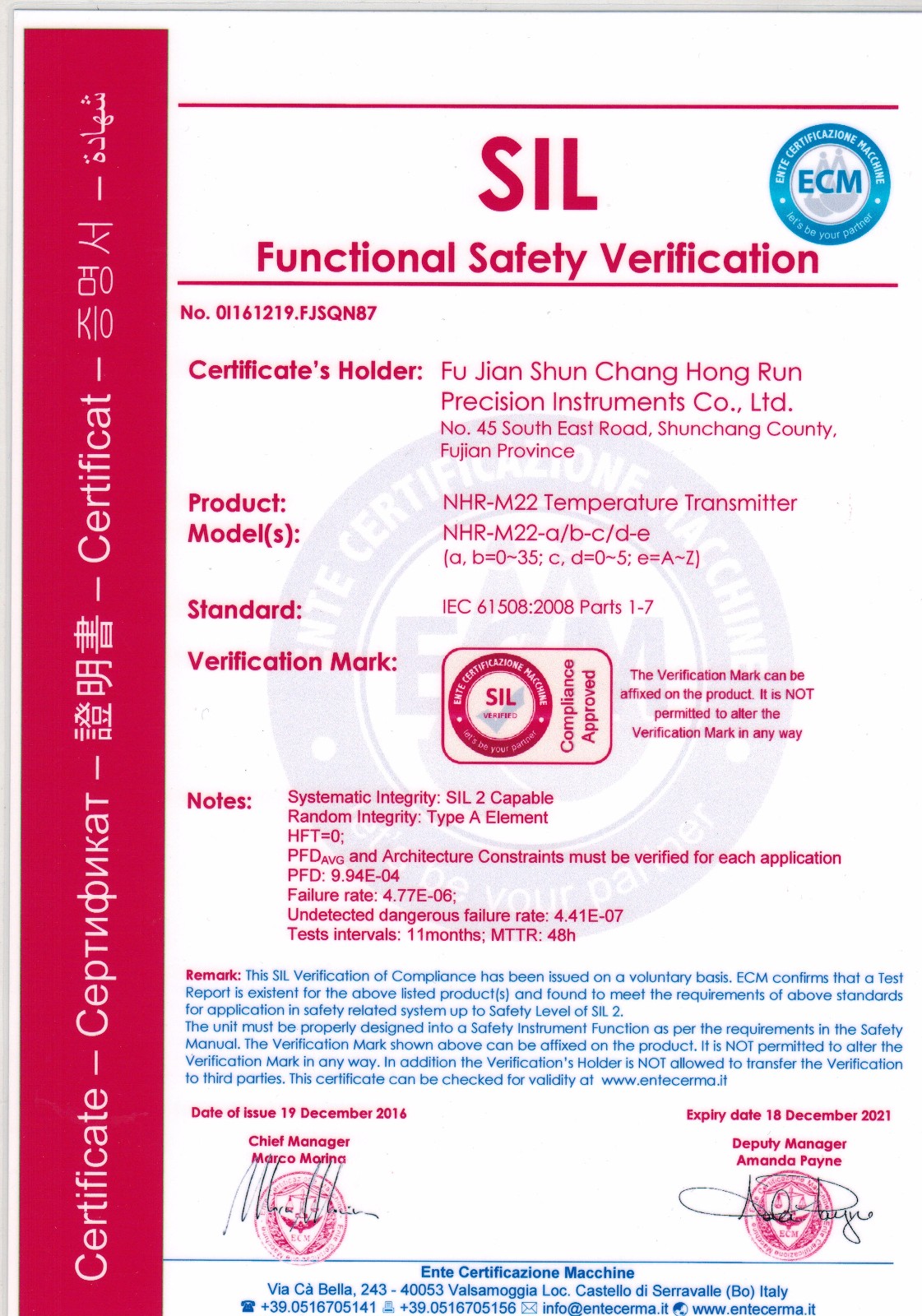 近日,虹潤智能儀表系列產(chǎn)品再傳喜訊,虹潤兩款智能儀表產(chǎn)品NHR-M22溫度變送器、NHR-M23配電器獲得了國際SIL2功能安全認證證書。這標志著虹潤儀表產(chǎn)品的安全性達到了國際標準。也為虹潤產(chǎn)品實現(xiàn)走向世界的美好愿景再一次打下了堅實的硬件基礎(chǔ)。