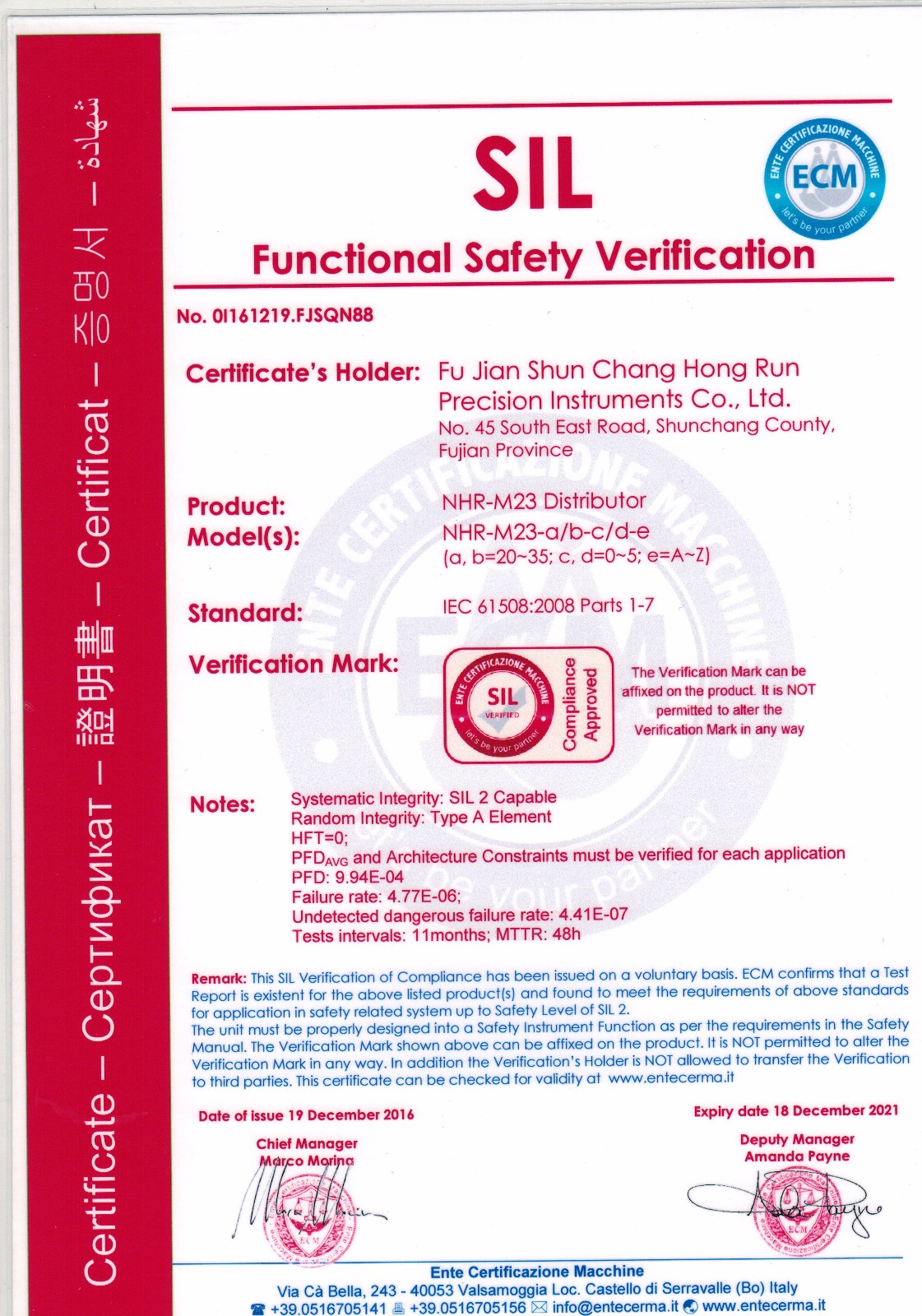 SIL2認證,是國際上公認的一種功能安全認證,英文全稱:Safety integrity Level—安全完整性等級。是根據(jù)國際電工委員會IEC頒布的功能安全標準IEC 61508(已轉(zhuǎn)化為國標GB/T 20438歸口標委會SAC/TC124/SC10)中對相關(guān)產(chǎn)品進行安全考核的認證要求。需要做SIL認證的產(chǎn)品,都是使用可能對人、環(huán)境或財產(chǎn)造成較高危害的場合,考核的主要目的也是,不能因為產(chǎn)品本身的功能問題,引起人員的傷害、環(huán)境污染和財產(chǎn)損失。